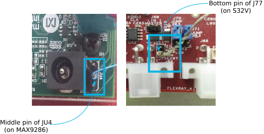 Using a wire, connect the middle pin of JU4 of the MAX9286 deserializer to the bottom pin of J77 of the S32V.