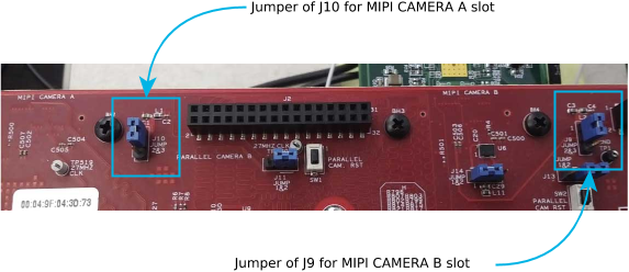 Remove the jumper from either J10 or J9, depending on which MIPI CAMERA slot (A or B respectively) you are using to connect the deserializer.