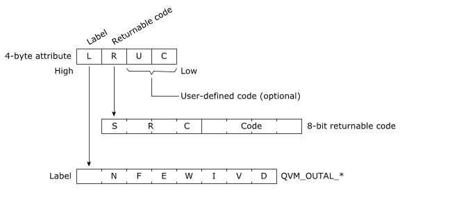 Label definitions are named as follows: QVM_OUTtype_source, where type is the message type, and source is the source of the message. For example, QVM_OUTN_QVM means that the qvm process has encountered a fatal internal error: N indicates that the error was iNternal, and _QVM indicates that the error was in the qvm process.