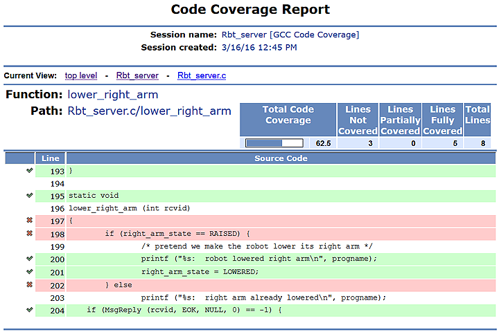 In this release, the IDE also uses the branch coverage metrics collected by gcov. These metrics include the number of times a branch was executed (which is really how many times the branch condition was evaluated), and the number of times each branch was taken. This second metric is quite helpful for ensuring that your tests cover every branch, which is essential for complicated programs.