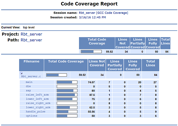 You can also add coverage data from included files to the report, by setting the right code coverage preference. When this preference is specified, the summary page has entries for functions in included files (in addition to those functions in the project source files).