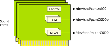 # ls -l /dev/snd total 0 lrw-rw-rw- 1 root root 0 May 31 11:11 capture -> pcmC0D0c -rw-rw-rw- 1 root root 0 May 31 11:11 controlC0 -rw-rw-rw- 1 root root 0 May 31 11:11 mixerC0D0 -rw-rw-rw- 1 root root 0 May 31 11:11 pcmC0D0c -rw-rw-rw- 1 root root 0 May 31 11:11 pcmC0D0p lrw-rw-rw- 1 root root 0 May 31 11:11 pcmPreferredc -> pcmC0D0c lrw-rw-rw- 1 root root 0 May 31 11:11 pcmPreferredp -> pcmC0D0p lrw-rw-rw- 1 root root 0 May 31 11:11 playback -> pcmC0D0p0p
