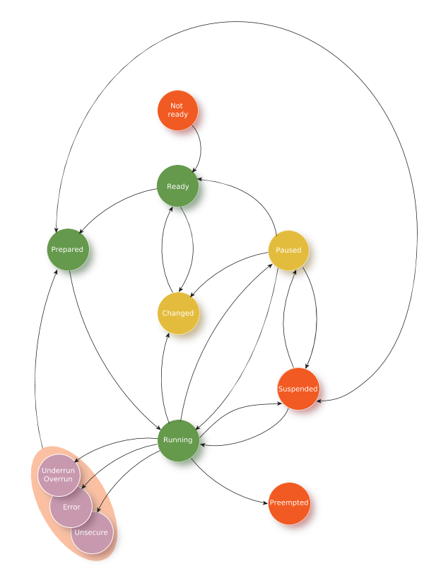 In the figure above, the oval groups the Underrun/Overrun, Error, and Unsecure states together to indicate that each state can transition to the Prepared state.