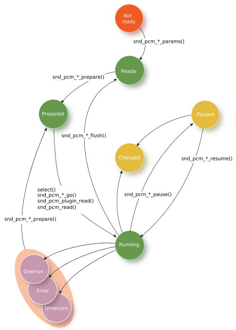 OVERRUN, UNSECURE, or ERROR | PREPARED | Calling snd_pcm_capture_prepare(), snd_pcm_channel_prepare(), or snd_pcm_plugin_prepare() |