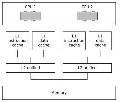 Since the cpuinfo structure is an array which for SMP systems is indexed by the CPU number, it is possible to construct a description of caches for CPUs with different cache architectures. Below is a diagram showing a two-processor system, with separate L1 instruction and data caches as well as a unified L2 cache: