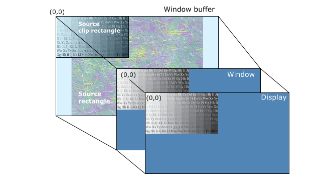 If you use clipped regions in the source rectangle of the window buffer, ensure that the source rectangle (or source view port) is contained within the clipped region. Your clip region should be at least the same size (or larger) so that the source rectangle can be contained within it. So avoid what's shown in the following illustration from occurring: