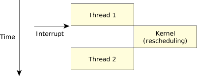 In this case, the servicing path is much shorter. We made one context switch from the currently running thread (thread1) into the kernel. Instead of doing another context switch into the ISR, the kernel simply pretended that the ISR returned a struct sigevent and acted on it, rescheduling thread2 to run.