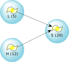 This is true; a higher-priority thread will always preempt a lower-priority thread. But something interesting can happen. Let's look at a scenario where we have three threads (in three different processes, just to keep things simple), L is our low-priority thread, H is our high-priority thread, and S is a server. This diagram shows the three threads and their priorities: