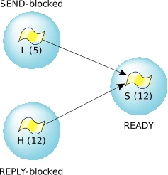 Currently, H is running. S, a higher-priority server thread, doesn't have anything to do right now so it's waiting for a message and is blocked in MsgReceive(). L would like to run but is at a lower priority than H, which is running. Everything is as you'd expect, right?