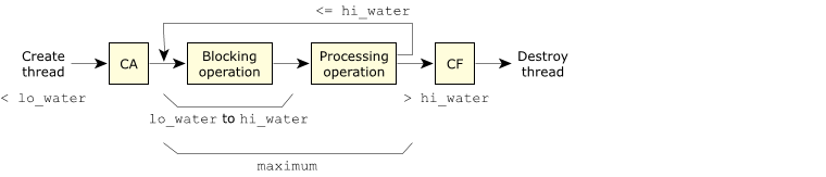 Now, one of the threads in the blocking operation unblocks (e.g., in a server application, a message was received). This means that now one of the three threads is no longer in the blocking operation (instead, that thread is now in the processing operation). Since the count of blocking threads is less than the lo_water, it trips the lo_water trigger and causes the library to create increment (2) threads. So now there are 5 threads total (4 in the blocking operation, and 1 in the processing operation).