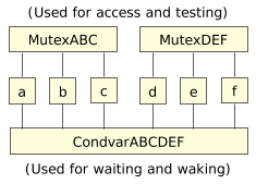 This is actually quite useful. Since the mutex is always to be used for access and testing, this implies that I have to choose the correct mutex whenever I want to look at a particular variable. Fair enough—if I'm examining variable C, I obviously need to lock mutex MutexABC. What if I changed variable E? Well, before I change it, I had to acquire the mutex MutexDEF. Then I changed it, and hit condvar CondvarABCDEF to tell others about the change. Shortly thereafter, I would release the mutex.