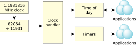 As you can see, there's a high-speed (MHz range) clock produced by the circuitry in the PC. This high-speed clock is then divided by a hardware counter (the 82C54 component in the diagram), which reduces the clock rate to the kHz or hundreds of Hz range (i.e., something that an ISR can actually handle). The clock ISR is a component of the kernel and interfaces directly with the data structures and code of the kernel itself. On non-x86 architectures, a similar sequence of events occurs; some chips have clocks built into the processor.