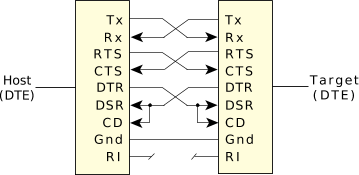 The QNX Neutrino target requires a supported serial port. The target is connected to the host using either a null-modem cable, which allows two identical serial ports to be directly connected, or a straight-through cable, depending on the particular serial port provided on the target. The null-modem cable crosses the Tx/Rx data and handshaking lines. Most computer stores stock both types of cables.