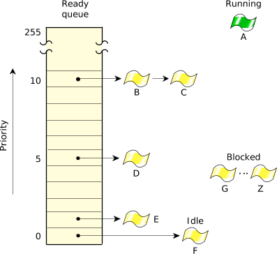 Every thread is assigned a priority. The scheduler selects the next thread to run by looking at the priority assigned to every thread in the READY state (i.e., capable of using the CPU). The thread with the highest priority that's at the head of its priority's queue is selected to run. In the above diagram, thread A was formerly at the head of priority 10's queue, so thread A was moved to the RUNNING state.