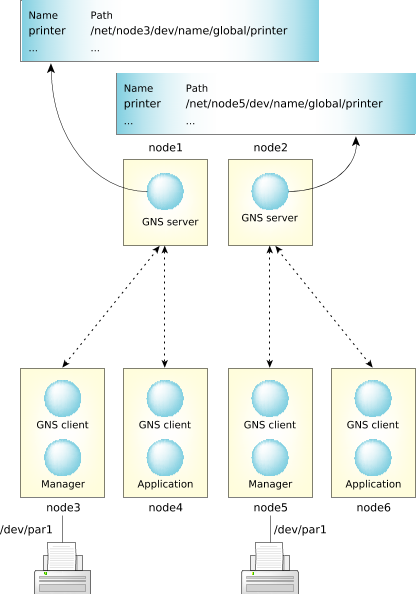 A service is represented by a pathname (without a leading /) and is registered under /dev/name/global or /dev/name/local, depending on how it attaches itself. Every machine running a gns client or server on the same network has the same view of the /dev/name/global pathname space. Each machine has its own local pathname space /dev/name/local that reflects its own local services.