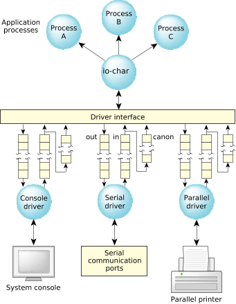 Device drivers simply add received data to the raw input queue or consume and transmit data from the output queue. The io-char module decides when (and if) output transmission is to be suspended, how (and if) received data is echoed, etc.
