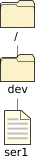 In a typical disk-based QNX Neutrino system, the directory / maps to the root of a filesystem on a physical hard drive partition. This filesystem on disk doesn't actually contain a /dev directory, which exists virtually, adopted via the process manager. In turn, the filename ser1 doesn't exist on a disk filesystem either; it has been adopted by the serial port driver.