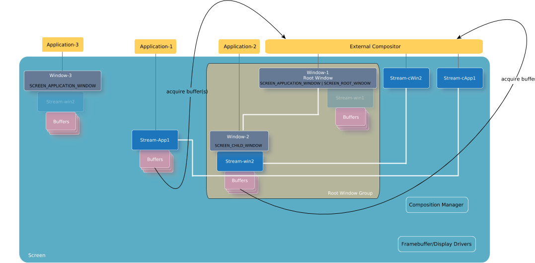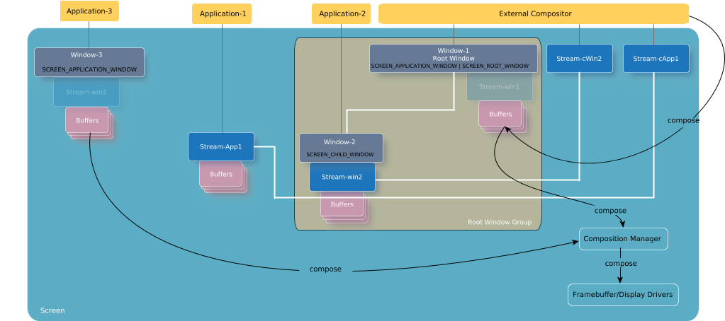 An external compositor is essentially a consumer. It consumes content from multiple sources (e.g., windows, streams, or both), and in turn, renders content to its own root window. Because Screen doesn't perform composition on any windows that have a root window as their ancestor, this strategy allows for an external compositor to manage the windows in its root window hierarchy. Using its privileges, as a parent as well as a root, the external compositor's window consumes content from the streams of its child windows. An external compositor can also consume from other producer streams. It then takes the consumed content and composes it into its root window's buffers. Once the external compositor is ready to make its content visible, it calls screen_post_window() to use Screen's framebuffer to show the content on the display.