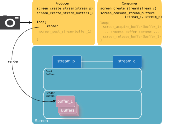 Buffers of producer streams are created by calling screen_create_stream_buffers(). These buffers are used for either rendering or posting. Initially, all the buffers that are created, are available for rendering. As the buffers are posted, they become front buffers. The front buffers are once again available as render buffers when all consumers have released them. Render buffers are available for producer streams to safely render into. These buffers are retrieved using the SCREEN_PROPERTY_RENDER_BUFFERS property of the stream. Front buffers have been posted by the stream (i.e., screen_post_stream() was called with these buffers). These buffers are retrieved using the SCREEN_PROPERTY_FRONT_BUFFERS property of the stream. Consumers use the front buffers of producer streams when they are consuming content. We don't recommend rendering into any buffer that's not available in SCREEN_PROPERTY_RENDER_BUFFERS because there's a risk that a buffer that's not in this list, is actively being consumed.