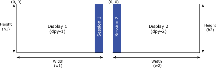... int w1 = 1280; /* width of Display 1 */ int h1 = 720; /* height of Display 1 */ int w2 = 1280; /* width of Display 2 */ int h2 = 720; /* height of Display 2 */ ... screen_display_t dpy-1; /* handle to Display 1 */ screen_display_t dpy-2; /* handle to Display 2 */ ... screen_session_t ssn-1; screen_session_t ssn-2; int ssn-1_pos[2] = { (w1-1), 0 }; int ssn-1_size[2] = { 1, h1 }; int ssn-2_pos[2] = { 0, 0 }; int ssn-2_size[2] = { 1, h2 }; ... screen_create_session_type(&ssn-1, context SCREEN_EVENT_POINTER); screen_set_session_property_pv(ssn-1, SCREEN_PROPERTY_DISPLAY, (void**) &dpy-1); screen_set_session_property_iv(ssn-1, SCREEN_PROPERTY_POSITION, ssn-1_pos); screen_set_session_property_iv(ssn-1, SCREEN_PROPERTY_SIZE, ssn-1_size); screen_create_session_type(&ssn-2, context SCREEN_EVENT_POINTER); screen_set_session_property_pv(ssn-2, SCREEN_PROPERTY_DISPLAY, (void**) &dpy-2); screen_set_session_property_iv(ssn-2, SCREEN_PROPERTY_POSITION, ssn-2_pos); screen_set_session_property_iv(ssn-2, SCREEN_PROPERTY_SIZE, ssn-2_size); ...