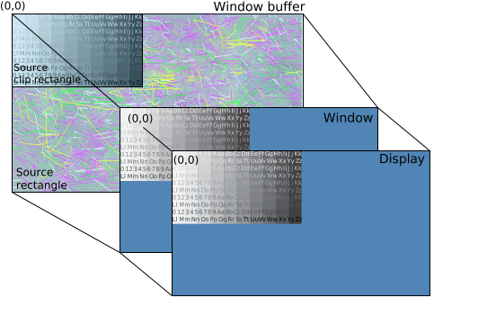 The source rectangle is the same size as the window buffer. That means that the source rectangle includes both your source image and parts of the buffer that's not intended for display. To prevent the unwanted area from being displayed, the source clip rectangle is set to the same size as your source image. By doing so, only your source image is targeted for display. The area that's not within the source clip rectangle is filled with the window background color (blue, in this case).