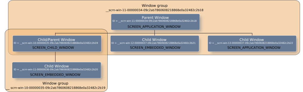A window hierarchy is established by using window groups. When establishing a window hierarchy, child windows use the parent window's SCREEN_PROPERTY_ID to join the window group. The parent window is the owner of the window group, and this is the group that child windows join. The parent queries its own SCREEN_PROPERTY_ID, as a string, and makes it available to child windows.