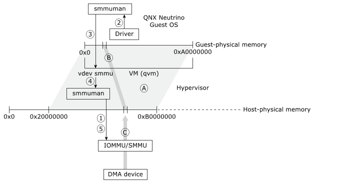 Each VM (qvm process instance) in the hypervisor host configures the smmuman service to program the board IOMMU/SMMUs to limit the host-physical memory to which DMA devices passed through to its guest have access. Any DMA device passed-through to a guest is limited to the host-physical memory region(s) assigned to that VM in its configuration (see the QNX Hypervisor User's Guide).
