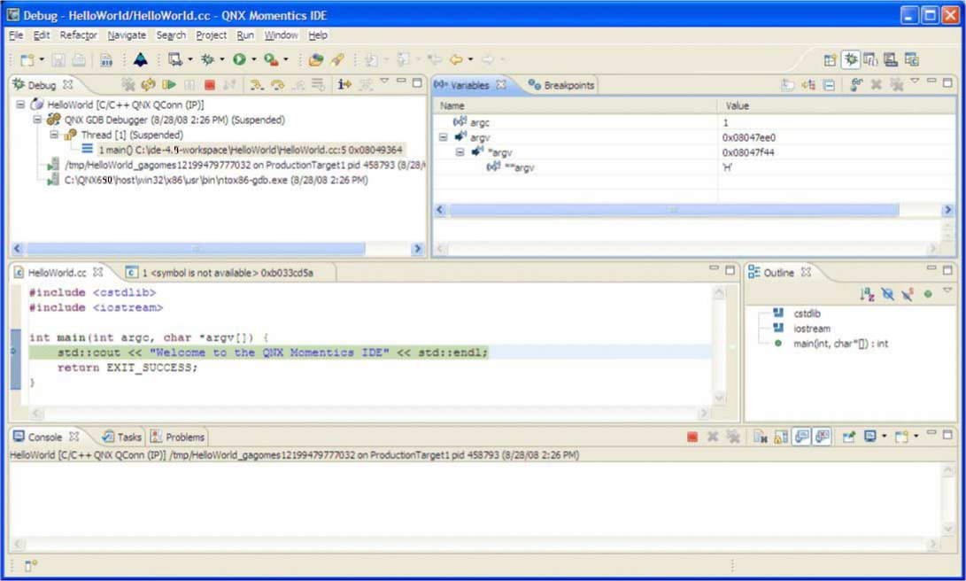 The default view of the Debug perspective for a simple HelloWorld QNX C++ project.