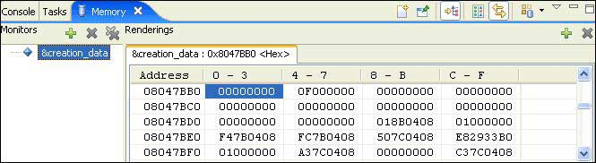 The Memory view lets you inspect and change your process's memory. To show this view, choose Windows > Show View > Memory. The view is initially empty, but after you've added an item to monitor and specified the output format, this view will look something like this: