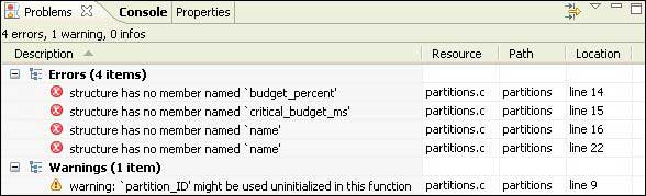 The Problems view provides you with a list of errors and warnings related to your projects. These are typically syntax errors, typos, and other programming errors identified by the compiler: