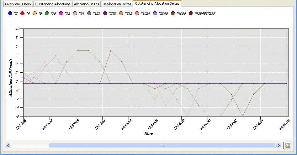 This graph shows the differences between the memory that was allocated and deallocated for the selected process; it shows a summary of the free memory. From this graph, you can observe which band(s) might be leaking memory, and by how much.