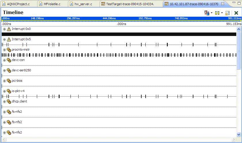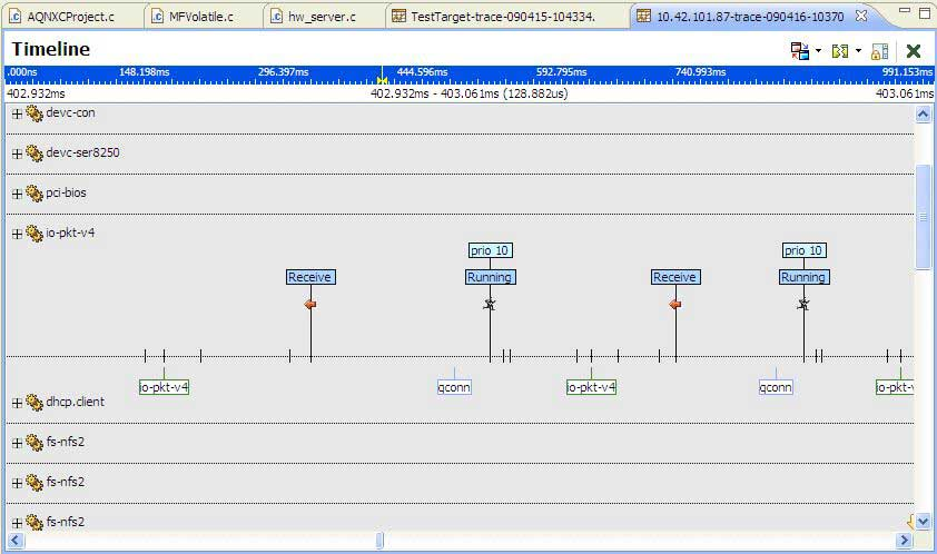 In locations where single events have been identified (for example, the Trace Log view, Search Results view), you can navigate directly to the event location in the System Profiler Timeline editor pane by double-clicking. The selection marker is moved to the event location and, if possible, the specific event owner is scrolled into view in the Timeline editor pane.
