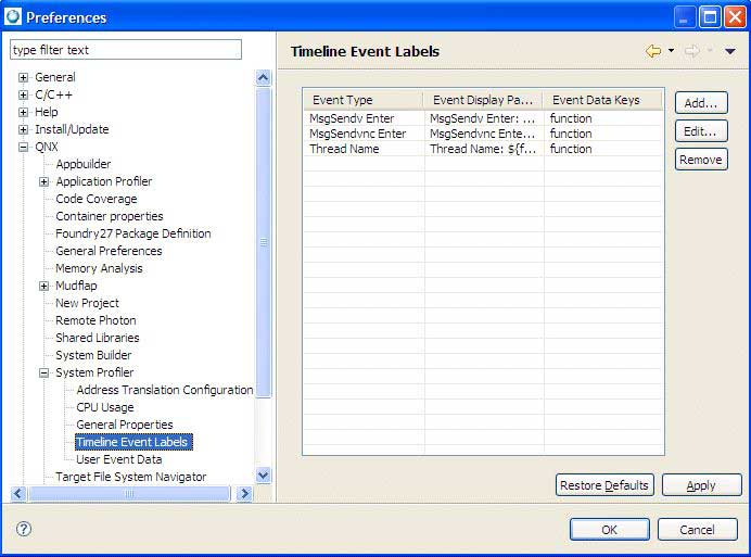 In the Preferences dialog, click Edit to edit any existing labels, or click Add to select an event type for which a label had already been defined. Any changes you make change the previously defined label, for which you'll receive a notification message.