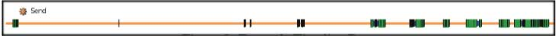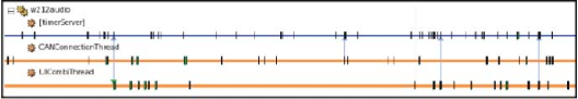 The timeline is laid out vertically as a sequence of timeline drawers. Each drawer corresponds to details about the log file, laid out horizontally along a time axis. There are two types of timeline drawers: processes and threads. Threads are grouped under their parent process. For each process or thread, its name is displayed along with a line that follows the time axis. The line is populated with markings for each event that occurred for the thread, and colored areas to indicate which state the thread was in during a given point in time. The following image shows an example of a thread shown on the timeline.