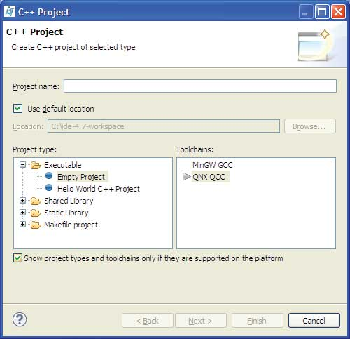 If you select a QNX C/C++ project, the first panel in the wizard looks like this: