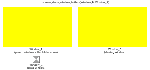 Buffers of child windows are not included in the shared buffers when you call screen_share_window_buffers(). Only the buffers of the window, not its children, specified in the API function are accessible to be shared. For example, suppose you have one window that has a child window. The parent window is just a yellow background and the child window has a buffer that contains the image of a simple hourglass shape. If another window shares buffers with the parent window, that window won't have access to the child window's hourglass shape.