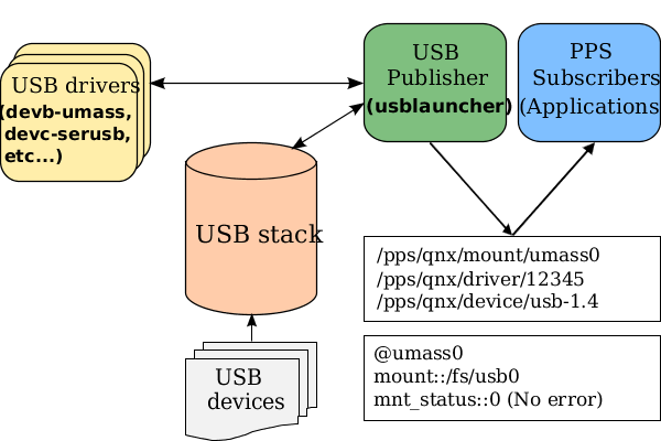 usblauncher launches the appropriate driver (e.g., devb-umass,