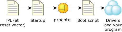 The startup program initializes the hardware by setting up interrupt controllers, cache controllers, and base timers. The program's code detects system resources such as the processor(s), and puts information about these resources into a centrally accessible area called the system page. The code can also copy and decompress the image filesystem components, if necessary. Finally, the code passes control, in virtual memory mode, to the procnto module.