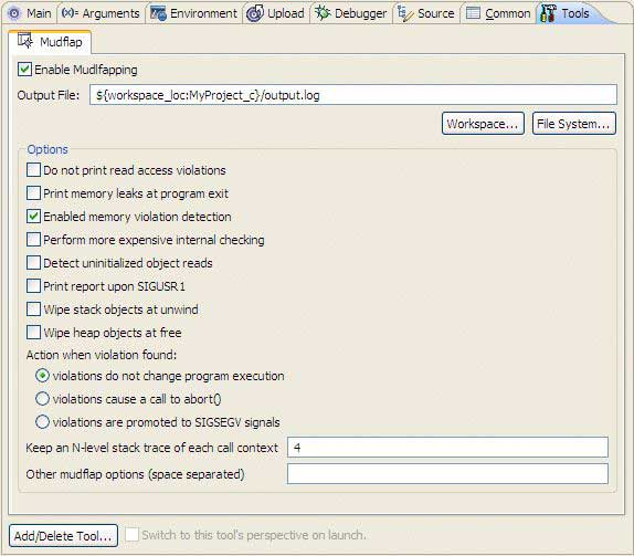 the Mudflap tool is added to the launch configuration; the Mudflap options are also set there.