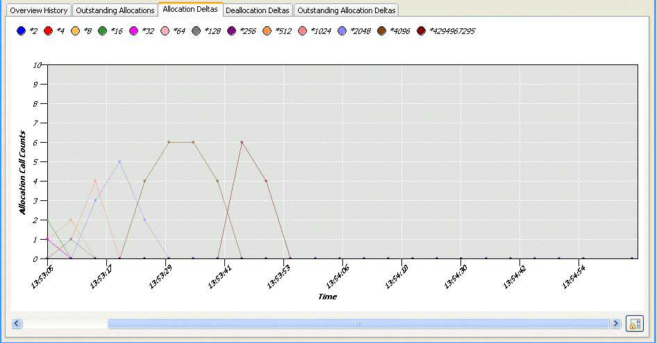 This graph shows the changes to the allocation of memory within your program over time for the selected process. From this graph, you can observe which bands have the most activity.