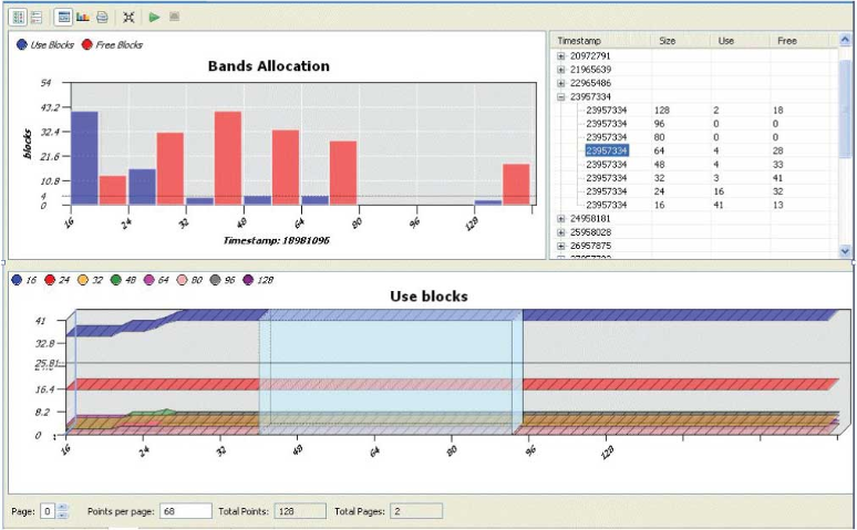 The counters for used and free blocks are listed in the top left corner of the tab. Click the circle to the left of each counter to enable or disable it in the Bands Allocation chart. This top chart shows allocation and deallocation counts for each band for the time range selected in the Use Blocks chart.