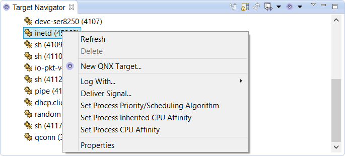 The Target Navigator view lists the targets and, for the connected ones, the processes running on them. Through this view's controls, you can configure kernel event tracing and adaptive partitioning for targets and send signals to processes, attach the debugger to them, and adjust their scheduling properties.
