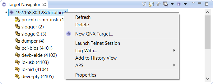 The Log With option lets you run a kernel event trace. When the trace finishes, the IDE presents the captured data as a target in the System Information History view. The Add to History View option copies the current list of target processes to a new entry in this same view. From the APS submenu, you can configure the adaptive partitioning scheduler, as described below in "Configuring APS". Finally, the Properties option opens the QNX Qconn Target panel for configuring the target connection.