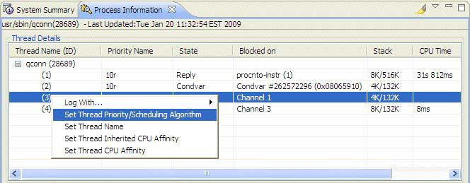 If you right-click on a process in the Target Navigator view or the Thread Details pane, you get similar options, except for setting the thread name. The Thread Details pane enables you to modify thread and process information for individual threads.