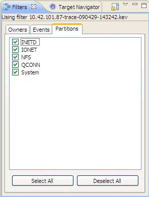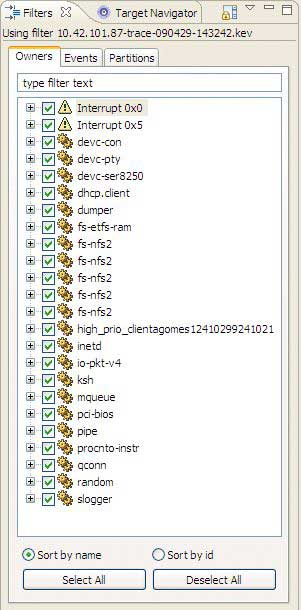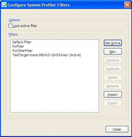 The Filters view is synchronized with the active System Profiler editor. You can display this view via the menu option or by right-clicking and choosing Show Filters View in the Timeline pane.