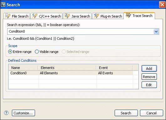 Searching is based on trace conditions. These describe the criteria for matching an event and can be based on any data that an event provides (ownership, data payload, etc). Unlike the other search dialogs in the IDE, the Trace Search can search for events only in the currently active System Profiler editor.