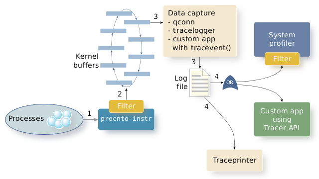 When you start a trace, the IDE tells qconn, which calls TraceEvent() to tell the kernel to start writing event data to the buffers and to inform it about all trace preferences, including filters.