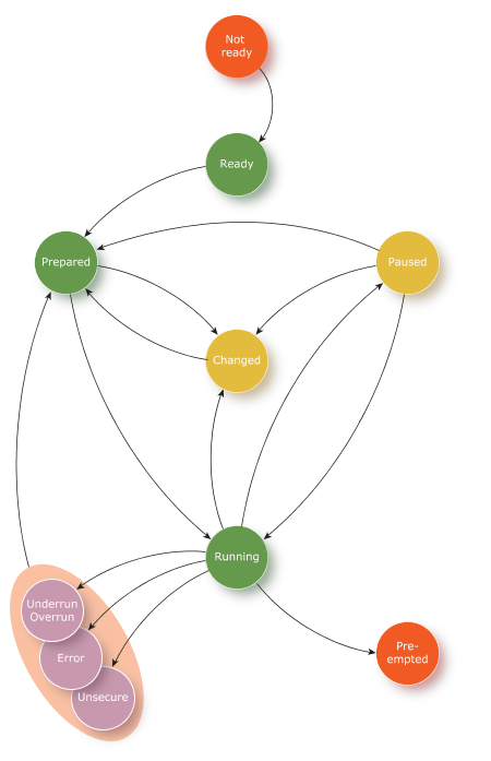 The transition between states is the result of executing an API call, or the result of conditions that occur in the hardware. For more details, see the Playing and Capturing Audio Data chapter.