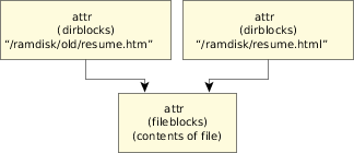 Figure 1. A hard link implemented as two different attributes structures pointing to the same file.In this case, both ../resume.html and resume.htm would be considered identical; there's no concept of "original" and "link" as there is with symlinks.