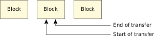Figure 2. Total transfer spanning a block.In the above diagram, the transfer starts somewhere within one block, and ends somewhere within the next block. There are no full blocks transferred. This case is similar to the case above it, except that two blocks are involved rather than just one block.